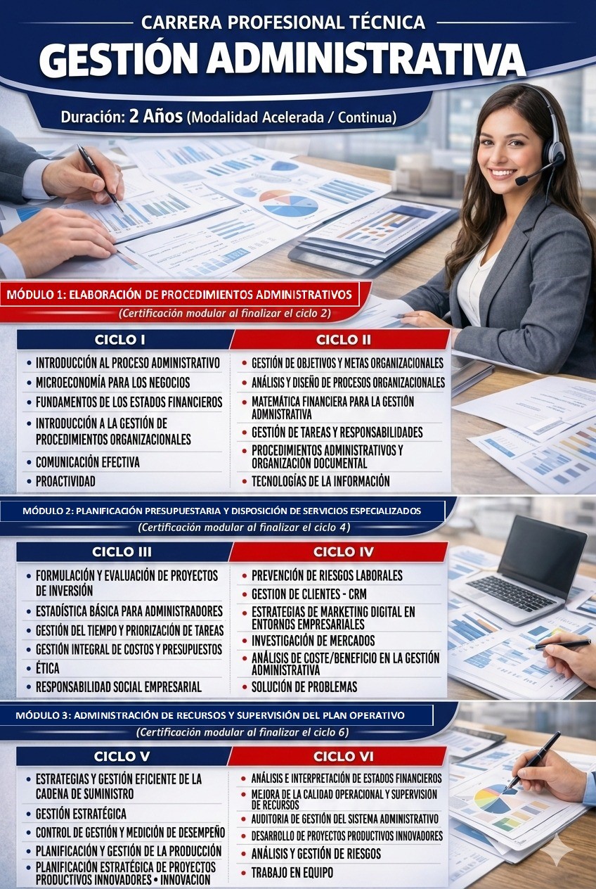 La carrera de Gestión Administrativa brinda conocimientos y competencias en organización, gestión de procesos administrativos, atención al cliente, manejo documental y apoyo en la toma de decisiones dentro de instituciones públicas y privadas.